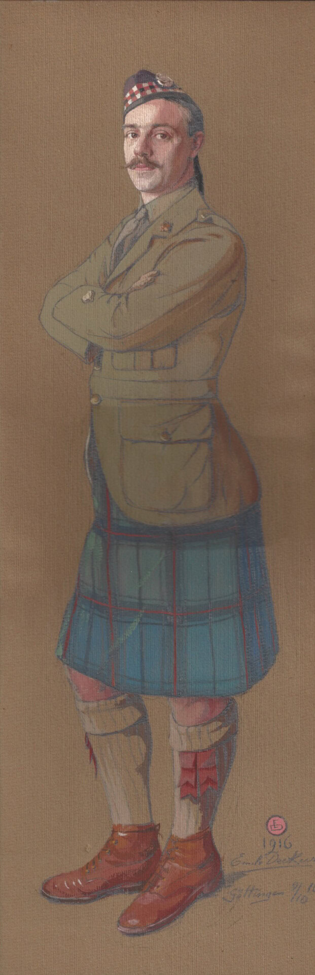 Wooden framed drawing on olive green paper rendered in pencil and colour paint of a 15th Battalion Highlander in Officers Tunic with Kilt and Glengarry, crossed arms with no sporran. 15th Bn CEF, CSM DeHarte was taken POW following the 2nd Battle of Ypres 1915. DeHarte was the RSM of the 48th 1921-27