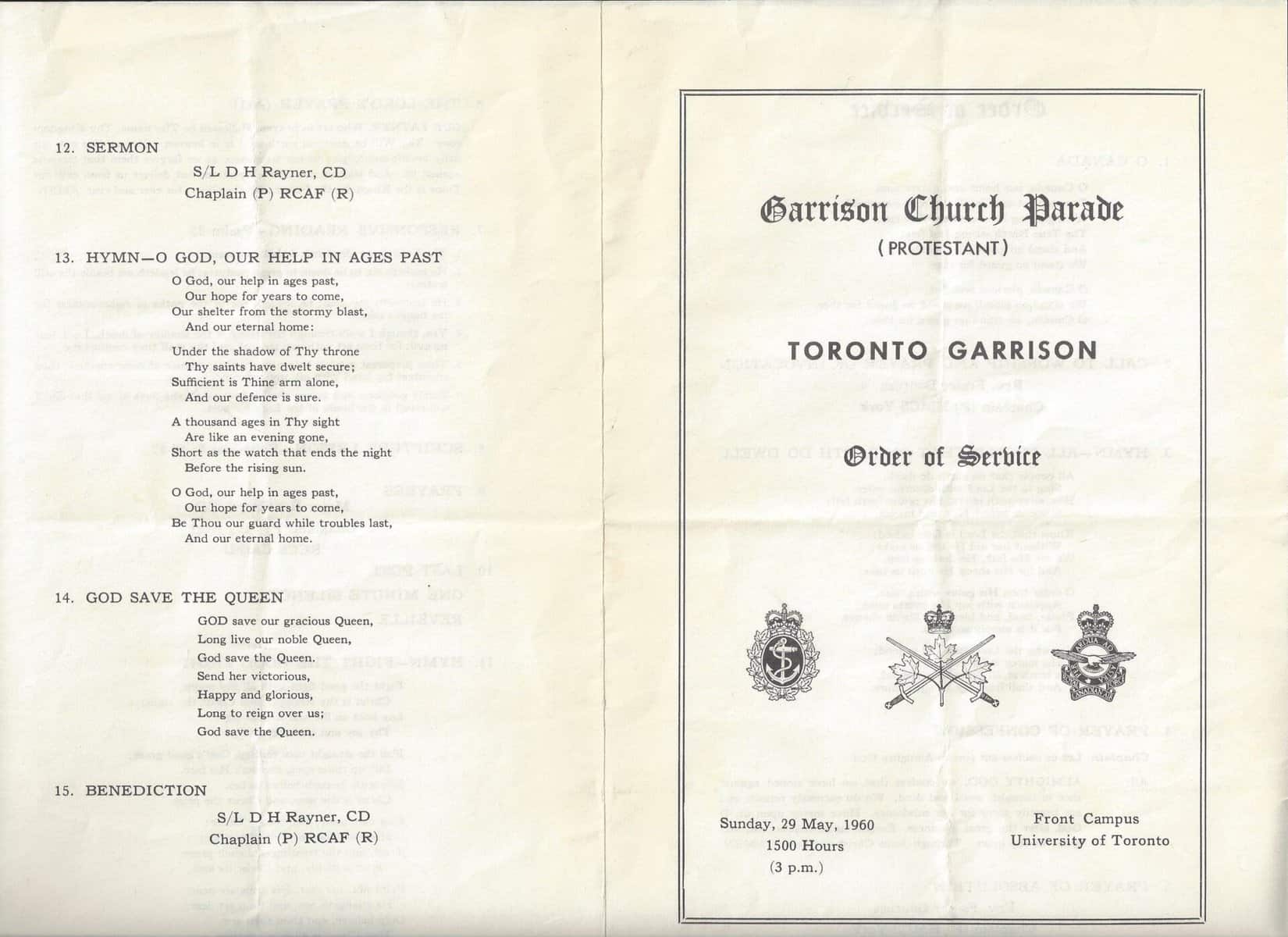 – Program Garrison Church Parade (Protestant) Toronto Garrison Order of Service Navy, Army and Air Force Badges Sunday, 29 May, 1960 1500 Hours (3 p.m.) Front Campus University of Toronto Order of Service Inside and Reverse O Canada Call to Worship and Prayer of Invocation Rev. Fraser Bournes, Chaplain (P) HMCS York Hymn – All […]
