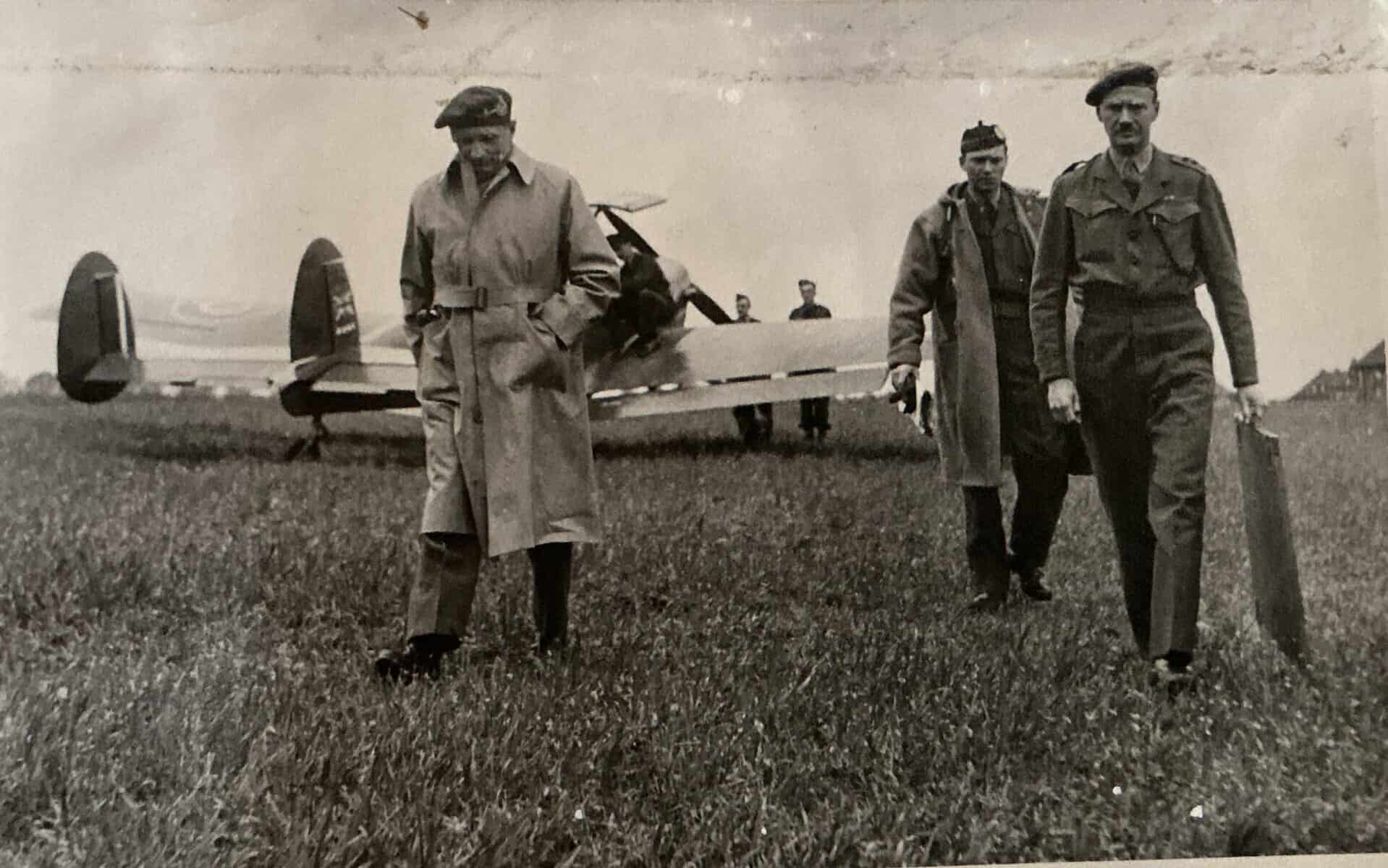 Field Marshal Bernard Montgomery of Alamein walking away from his plane, likely Normandy 1944. Behind Montgomery is LCol Trumbull Warren, Personal Assistant to Montgomery and another staff officer carrying a folio.