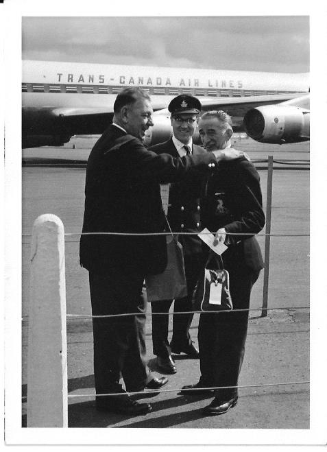 Two members of the 48th Highlanders Old Comrades Association with pilot in front of Trans Canada Air Lines for trip to Scotland, Sept 9, 1963 P1588