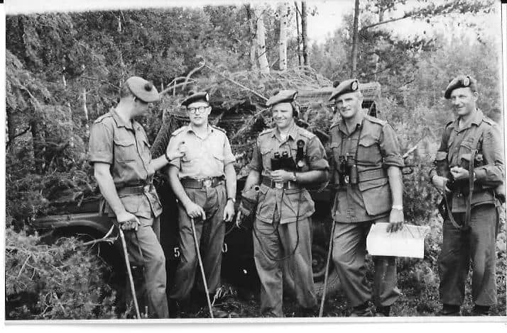 Officers next to camouflaged jeep, probably in Borden or Petawawa in 1960s (likely 1964). Major PAG Cameron, Captain W. Davidson (Medical Officer), LCol JM Lowndes, Major RL Read with Sgt RL Cormack. P1589