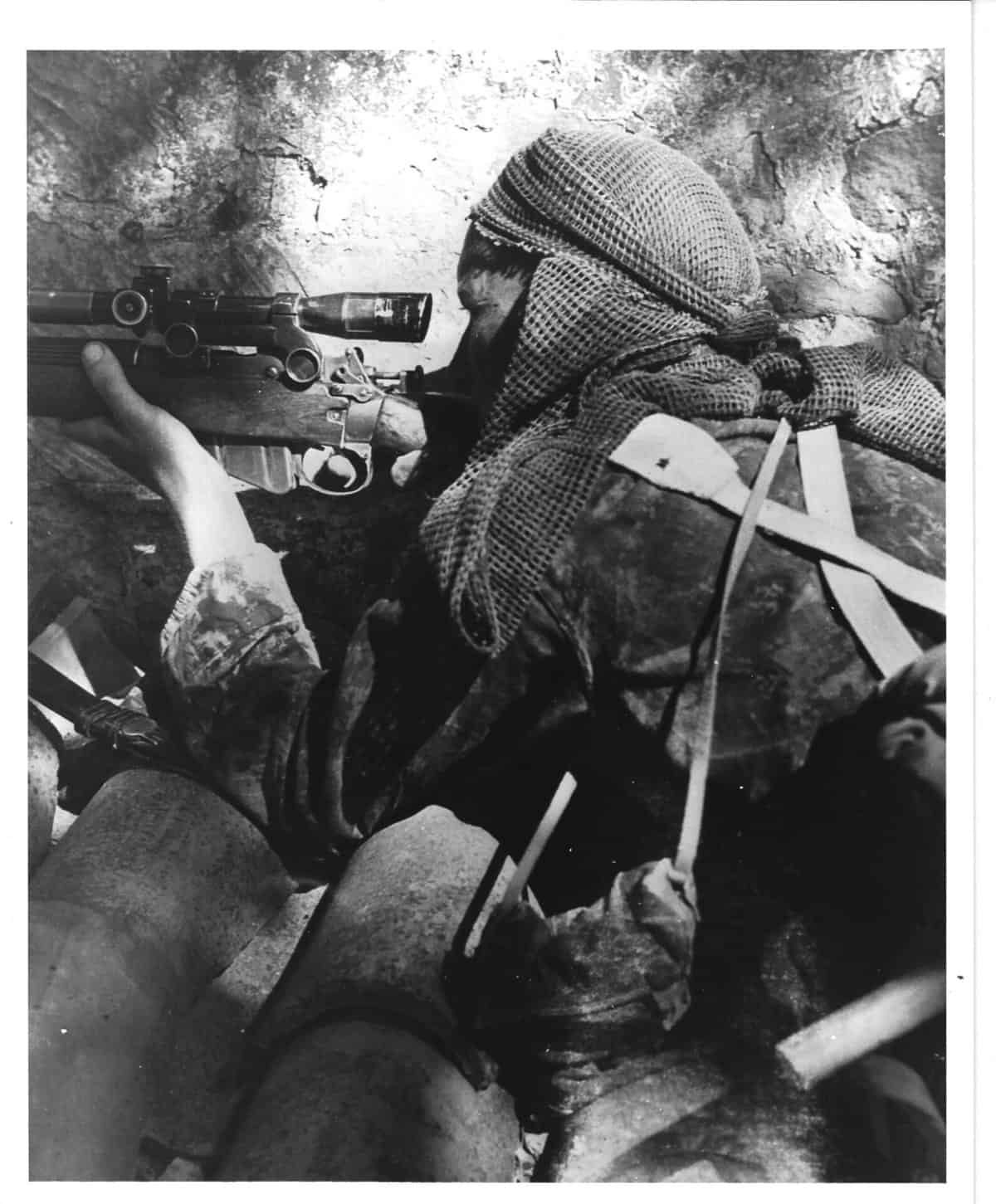 Private L.V. Hughes, 48th Highlanders of Canada, sniping German position near the Foglio River, Italy, 1944. P0581