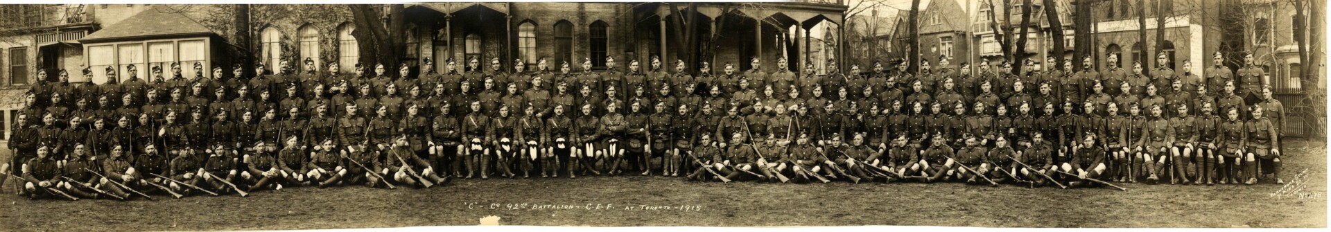 A 7 inch (17.78 cm) by 46 inch (116.84 cm) black and white photograph of 92nd battalion C Company CEF Toronto 1915.