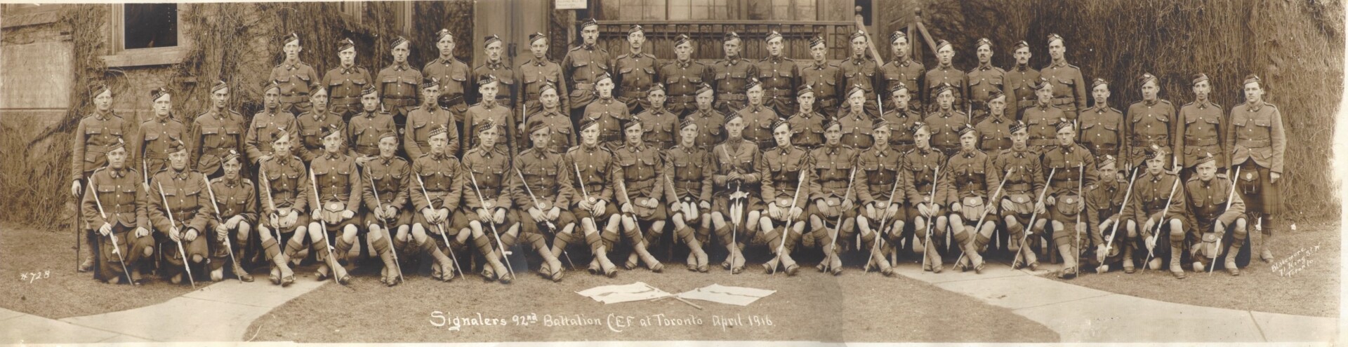 An 8-inch (20.32 cm) by 28.5 inch (72.39 cm) sepia photograph of Signalers 92nd Battalion CEF at Toronto April 1916