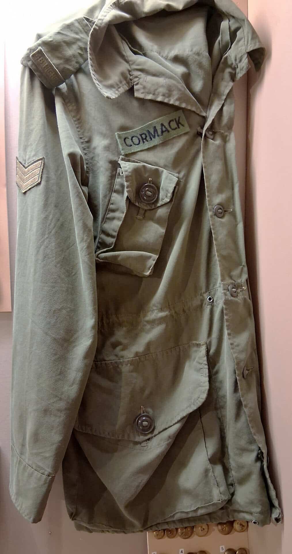 Combat shirt in olive green. Name “Cormack” on left breast pocket and Sergeant’s stripes on arm. In 1967, the Royal Canadian Army ceased to exist and was replaced with Mobile Command under the Unification scheme which created the modern-day Canadian Armed Forces. With Unification, an American-Style Olive Green Fatigues known as “combats” were adopted. This […]