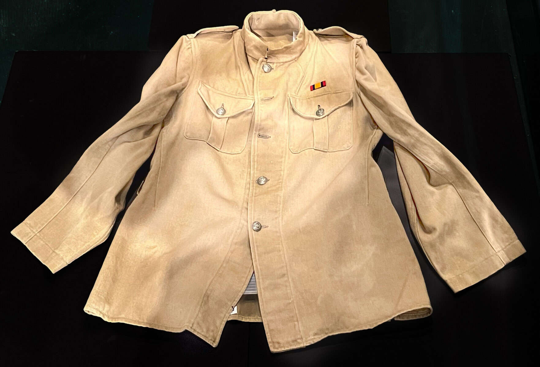 An other ranks khaki drill tunic, with silver coloured Canada general service buttons of the pattern 1855-1901. On the right breast is a ribbon for the Queens South Africa Medal. Note: This object was originally accessioned with the number, 999.50.1.