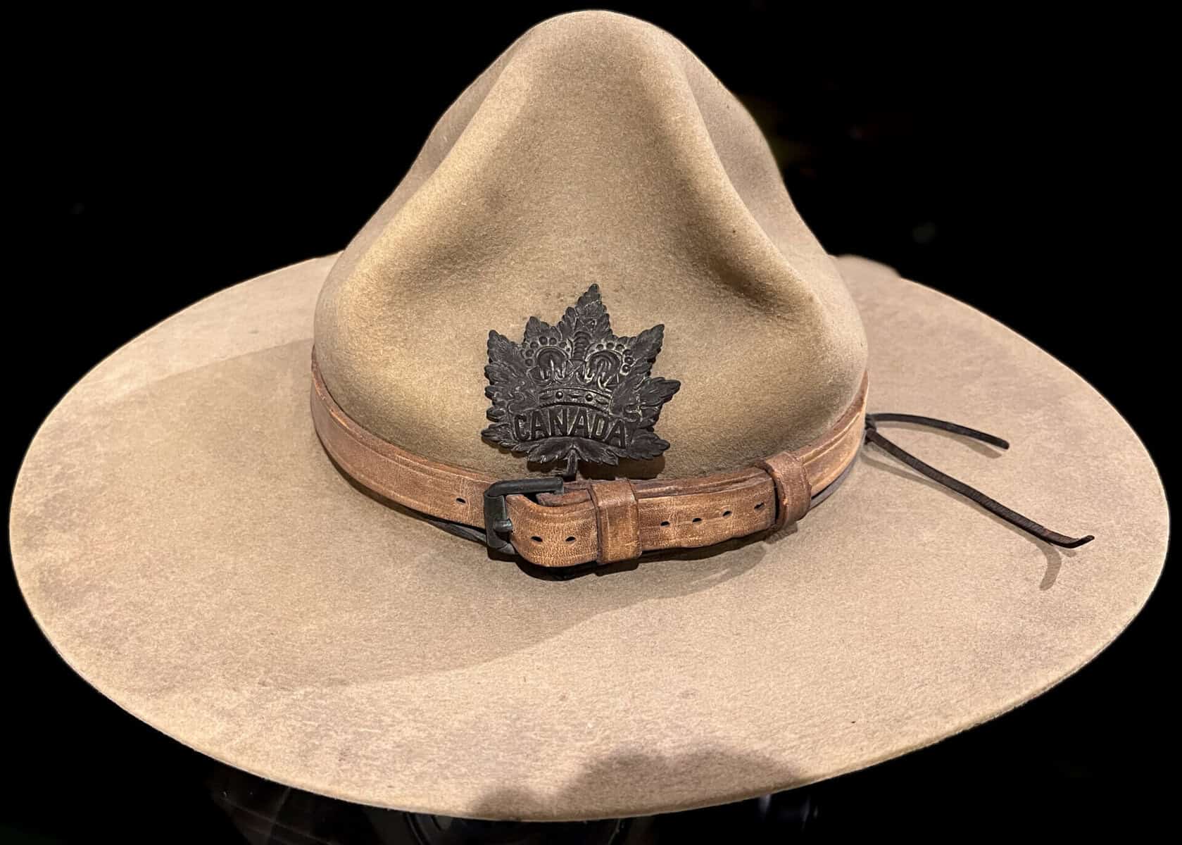 South African War era Stetson hat belonging to Sergeant Odlum, who served in South Africa with the Canadian Scouts (1902). The object consists of the hat, external hat bands (one thick and one very thin) mounted where the crown meets the brim, a hat band buckle, and a Victorian general list Canada cap badge (that […]