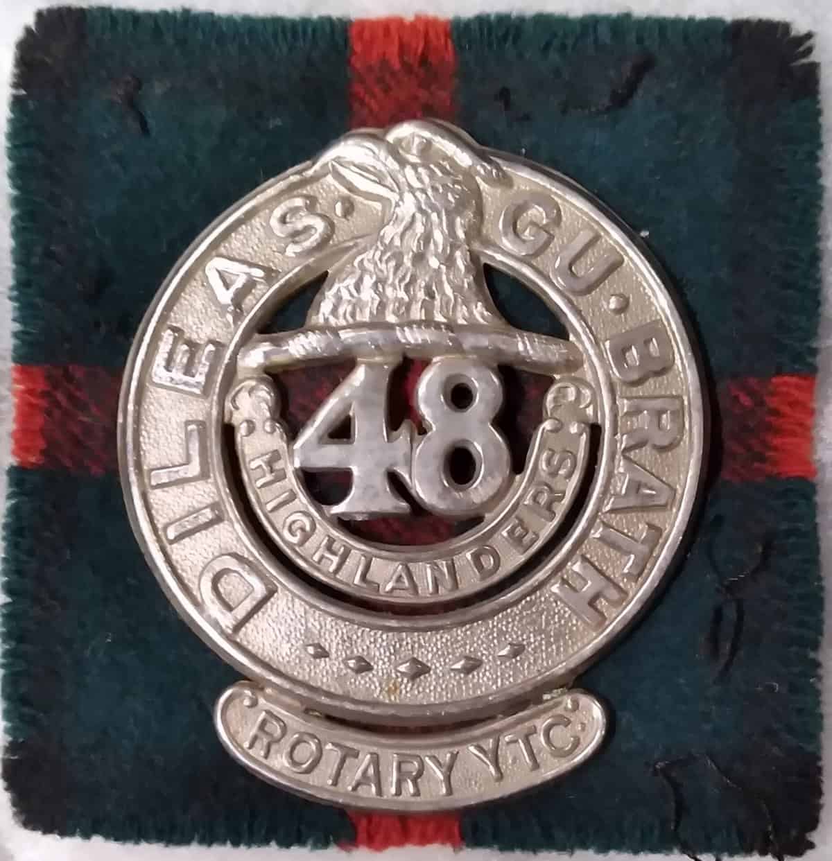 48th Highlanders Rotary Y.T.C. cap badge. Tartan (Davidson) square backing 3″ by 3″. Donated by Major J Eardley Wright – 1st Bn
