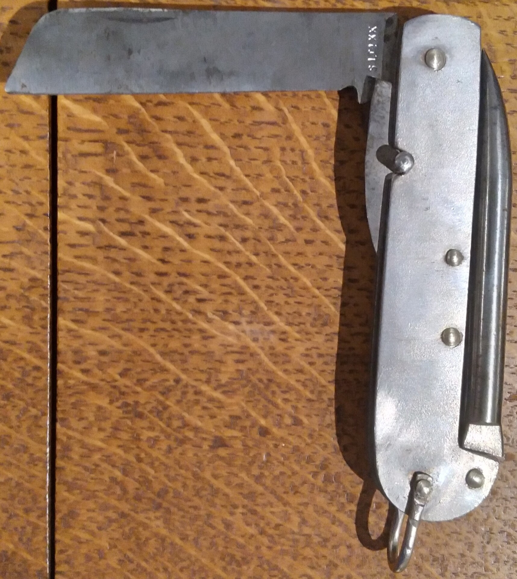 Small, grey, steel Case M346, with sheepfoot-blade knife, marlin spike, and can opener. Held together by rivets and has a metal loop on one end for hanging and carrying. Stamped on bottom of one side of the knife is maker’s name reading: “M.S. Ltd XX”, for Metal Stamping Ltd. This model of clasp-knife is originally […]