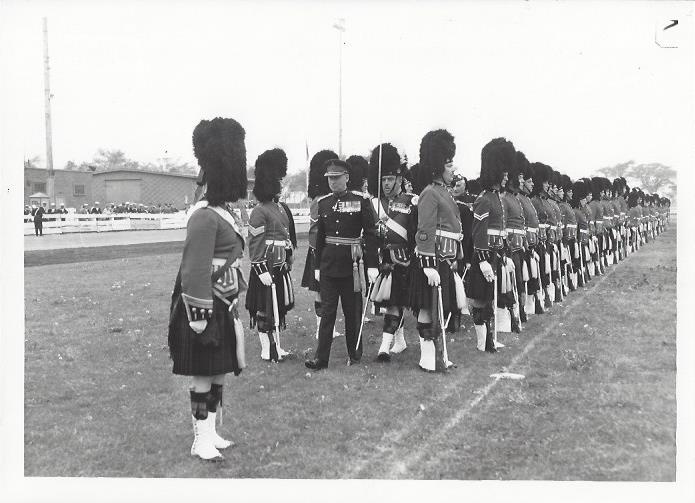 General Graham inspects 2nd Rank at the 48th Highlanders’ Trooping the Colour held at the CNE Stadium on 2 June 1956. Accompanying Gen Grahams is the Commanding Officer, LCol KCB Corbett.