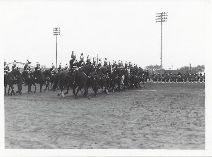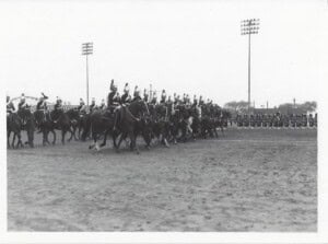 The Governor General Horse Guards ride past in Review Order, at the 48th Highlanders’ Trooping of the Colour at the CNE Stadium, 2 June 1956.
