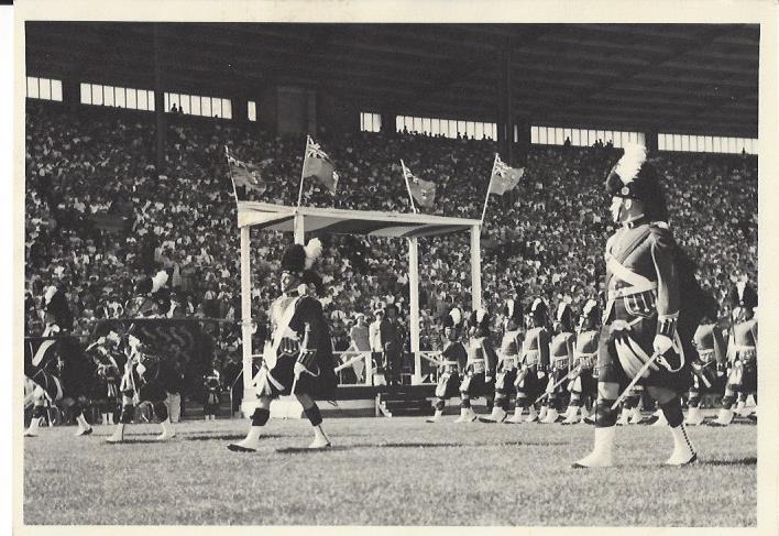 Guard march past Her Majesty Queen Elizabeth II, Colonel-in-Chief of the 48th Highlanders of Canada at the Trooping of Colour at the CNE in 1959. LCol John Lowndes, Commanding Officer leads the regiment conducting Eyes Right to Her Majesty.