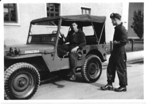 Two 48th Highlanders of B Company, 27 Brigade with jeep in Germany. Left to right Baird and Balfe.