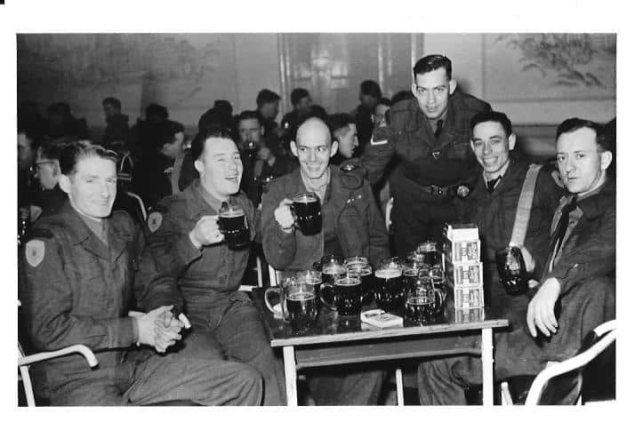 27th Brigade Troops having a beer in Germany, 1951,52. From left to right is Williams, Baxter, Townley, Briggs, Thompson and Brown.