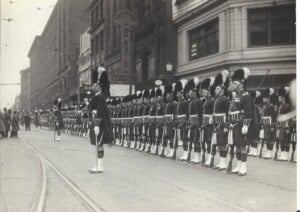 Unit standing at attention as Guard of Honour for His Honour, Herbert Alexander Bruce, Lieutenant Governor of Ontario, outside the Colonial Theatre on Queen Street West., Toronto, April 22, 1934.