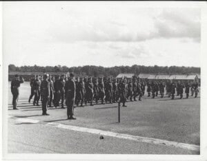 1st Bn, 48th Highlanders of Canada, give eyes right to reviewing officer as Pipes and Drums play, at Trooping the Colour. It was the  50th Anniversary of formation of the Regiment, and It took place in Redhill, Surrey, UK, 1941.