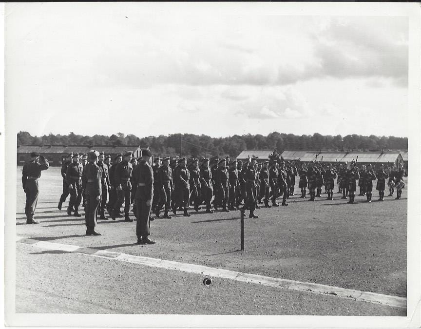 1 Bn, 48th Highlanders of Canada march past reviewing officer and give eyes right, at 50th Anniversary Trooping the Colour in Redhill, Surrey, UK 1941.