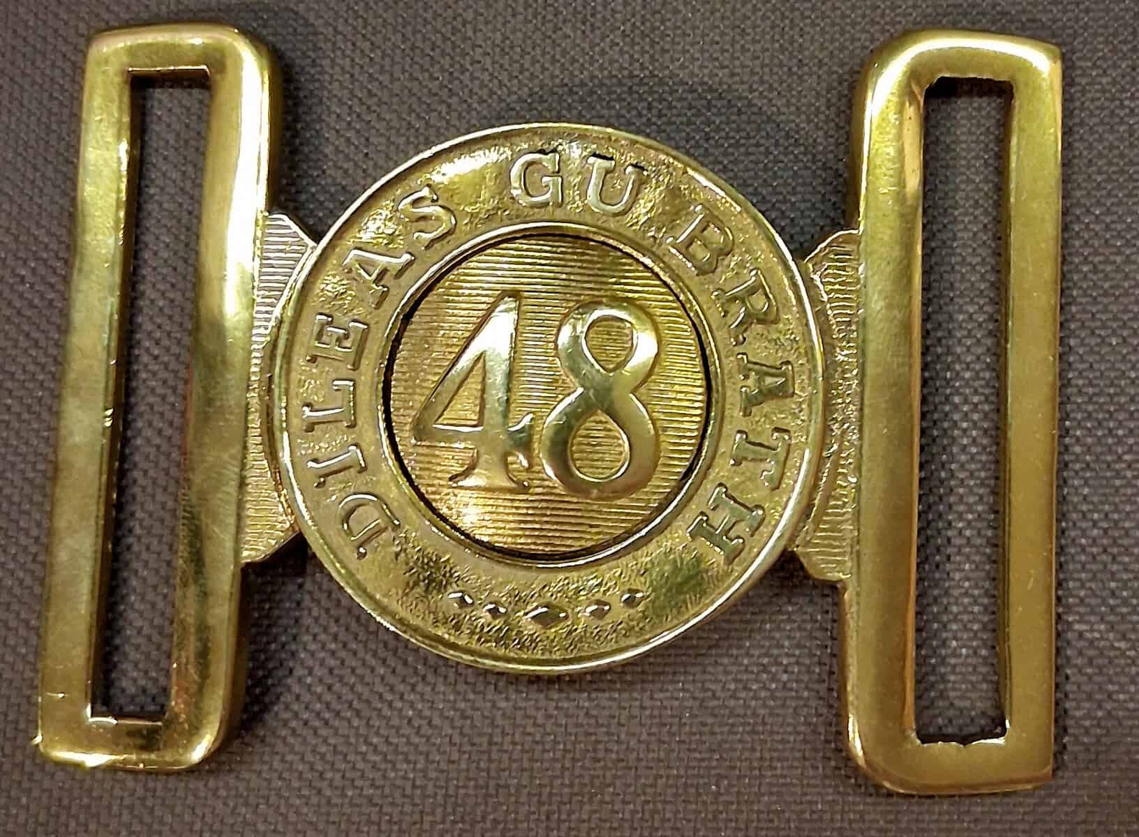 A 3.76 inch (9.57 cm) by 2.75 inch (6.98 cm) badge with the 5 Lozenge pattern design. Came into service use in 1971. The badge comes in two parts as a buckle for the waist belt. The lozenge pattern at the bottom of the badge replaced a Scottish Buckle design. The Department of Defence had ruled that it was a Buckle of the Garter and the regiment was not entitled to wear that pattern. In return for DND agreeing to add “of Canada” to the 48th Highlanders name, the regiment agreed to adopt the lozenge design. In the 1980s, former RSM William Elms took the issue to the Lord Lyon in England and he ruled that it was a Scottish buckle. The regiment reverted to its original buckle design.