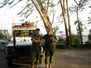 In vehicle park at Hill Cot Flats, Sierra Leone on 06 December 2006 Lcol Don Haisell on left, Captain Alkema on right. Haisell and Alkema worked together in Cyprus in 1985 where Haisell was Alkema’s direct superior. Haisell was also Comd TFFT for OP SCULPTURE Roto 11, which was replaced by the 48th Highlanders.