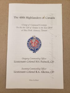 Colour photo of officers at Change of Command, 12 October 2018 from LCol HS Pedwell to LCol RA Alkema in Officers’ Mess under official portrait of HRM. Photo wrapped in cellophane. Officers names printed under photo.