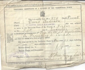 (Unit) 5th Battn. The Black Watch who was enlisted to serve in the Territorial Force of the County of Forfar on the Fifth day of November 1912, is discharged in consequences of Para 156 (3) J.F. Regulations on Proceeding to Canada and that his claims have been properly settled.