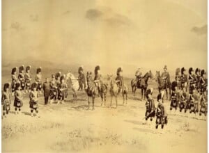 Back Row (Left to Right): Lt D.H.McLean, Lt Donald, Lt Campbell, Lt Cosby, Capt MacDougall – on horse (Acting Adjutant), Surgeon Stuart – on horse, Lt Perry, Lt C.A.H. McLean, Lt Mitchell, Lt Ramsey, Lt Ramsay, Lt Thompson