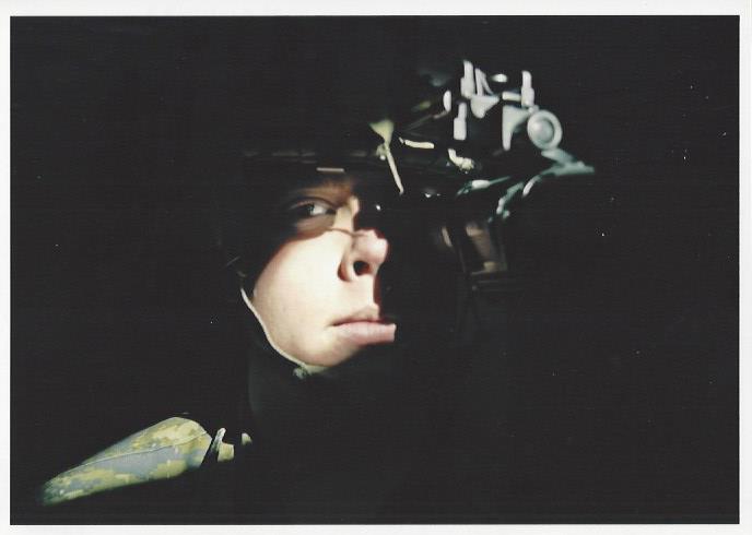 MCpl Corey Bennett, 48th Highlander, in the shadow, looks through a scope.