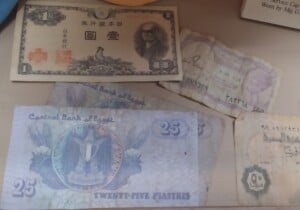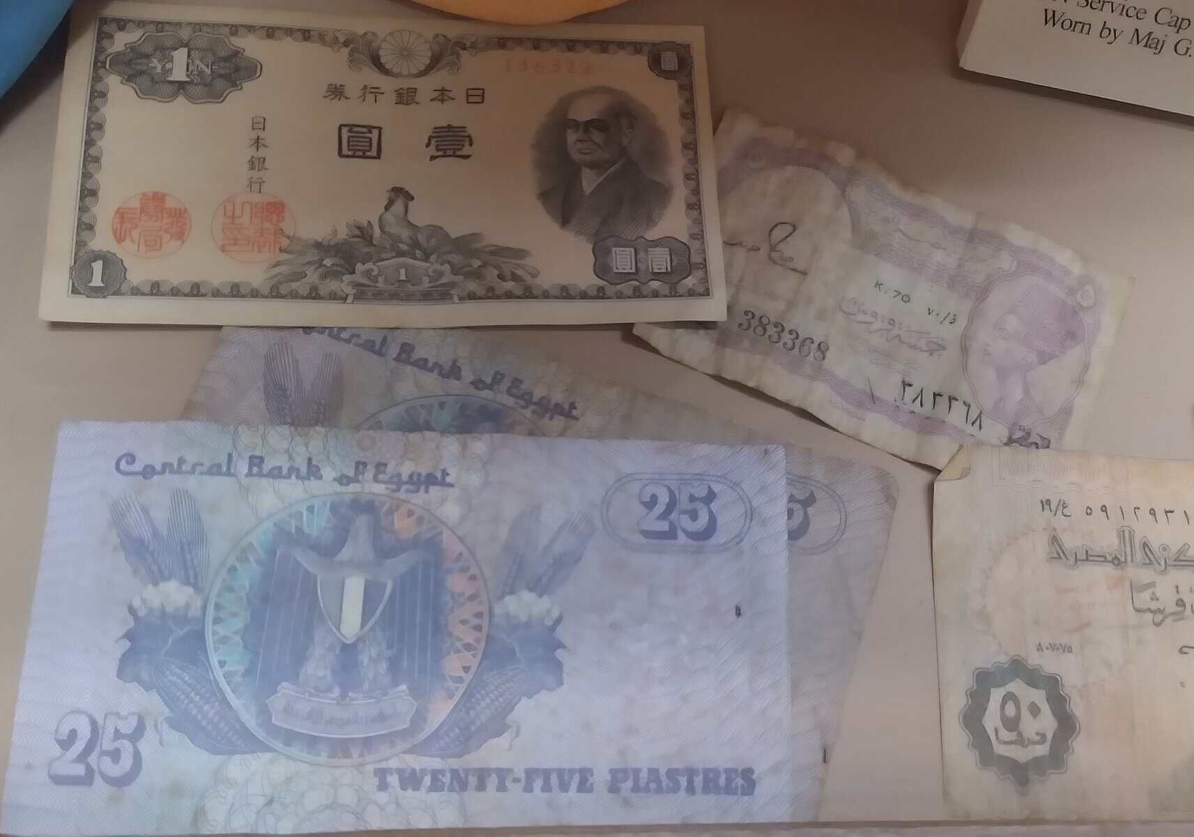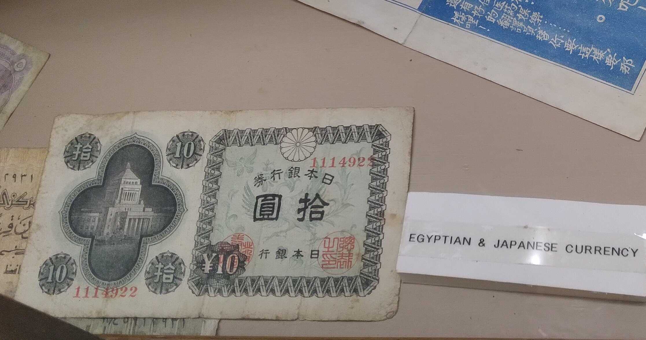 Currency bills of various denominations from Japan and Egypt brought back by Highlanders who served overseas in the respective countries.