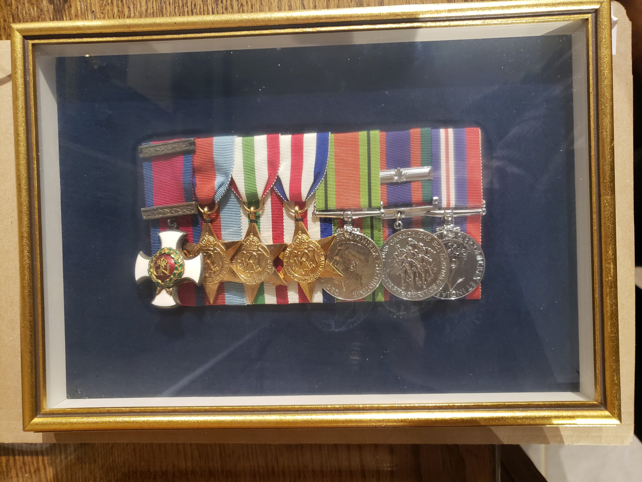 To the back of the frame is attached at printed form entitled: Information regarding the Wearing of Decorations, Campaign Stars and Medals Generally, which provides instructions on the wearing and mounting of Second Word War medals, as suggested by the title. Written in blue ink in the lower right corner of the form is the inscription: