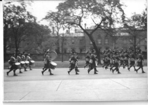 Pipes and Drums of the home battalion marches past Osgood Hall on the way to Camp in 1945. P1555