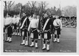 Colour party for Remembrance Day, Nov 6, 1939. L/Cpl Peddell, CSM Elms, CSM Ashling, RSM Jamieson, Lt. King and Lt. Peter Bennett on left. The 48th Highlanders conduct a parade to their War Memorial at the head of Queen’s Park circle on the closest Sunday before Remembrance Day, Nov 11. They began the tradition the year the Memorial was erected in 1923. The tradition continues to this day. P1591