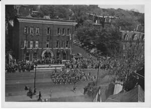 A roof-tip view of the 48th Highlanders Band marching past 519 Church Street for opening of the new 48th Highlanders Memorial Hall, 1946.