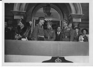 Close up view of reviewing stand. Lieutenant General H.D. Graham in the centre between LCol Ganong, Commanding officer and Viscount Alexander to the right. Viscountess Margaret is to the left of LCol Ganong. The event was the opening of the 48th Highlanders Memorial Hall at 519 Church Street. Lieutenant General Graham took the Salute.
