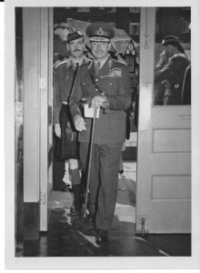 Lieutenant General H.D. Graham enters the 48th Memorial Hall, following the dedication ceremony at which he took the formal Salute on 26 May 1946.