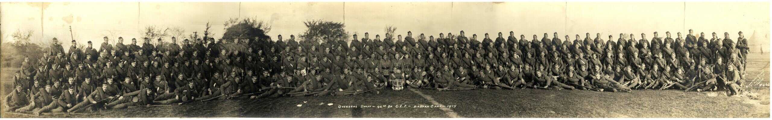 A 7 inch (17.78 cm) by 46 inch (116.84 cm) black and white photograph of Overseas Draft 92nd Battalion CEF Camp Niagara 1915.