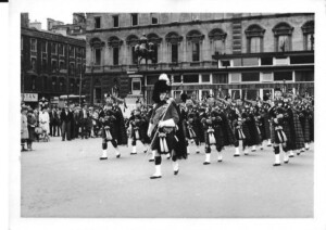 48th Highlanders Pipes and Drums marching in St. George’s Square, Glasgow, Scotland, September 9, 1963. Drum Major Don Fletcher in front, Pipe Major Ross Stewart on left and Sergeant Robert Taylor behind him. P1547
