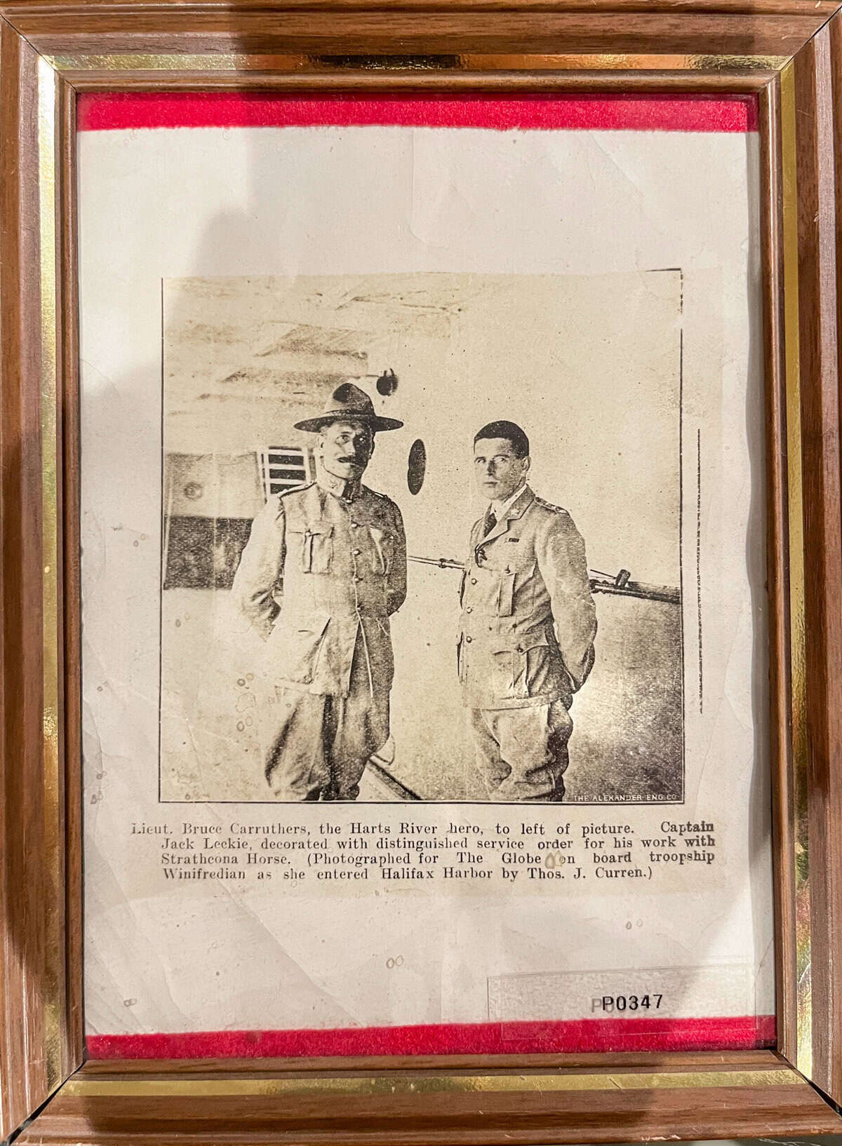 A framed black and white newspaper photograph of Lt. Carruthers, with Captain Jack Leckie, D.S.O., published in the Globe newspaper. The photograph is undated.