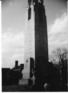 Regimental War Memorial with sentry at Remembrance Day parade in 1980s or 90s. The War Memorial is located at the head of Queen’s Park Circle in Toronto. Since the War memorial was erected in 1923 the regiment has conducted a Remembrance Parade on the closest Sunday before November 11. P1587