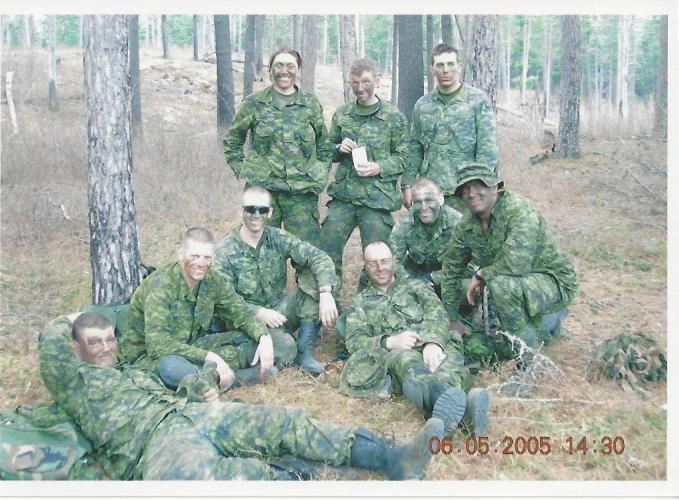 Section of 48th Highlanders relax in the field on exercise. Cpl Irina Marga standing to rear on left with MCpl Owoh in centre.