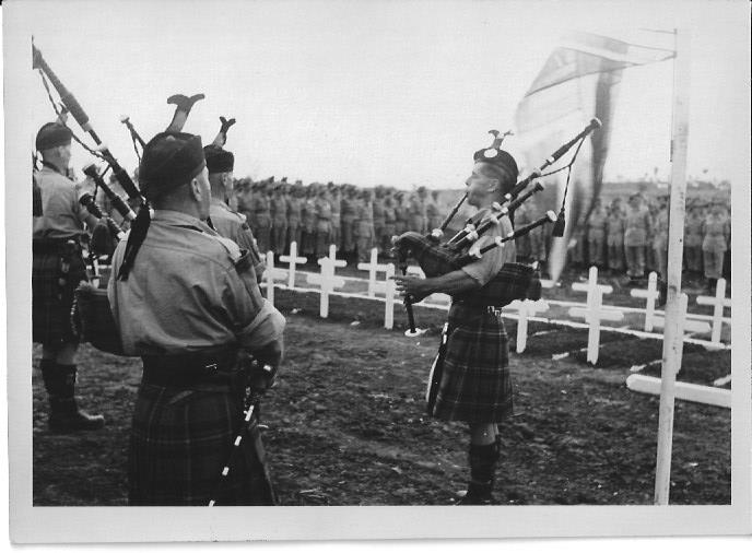 48th pipers playing at Piedmonte, Cemetery service, May 1944. Pipe Major Keith facing the band.