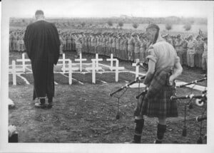 Padre East gives prayer at service at Piedmonte Cemetery, May 1944. The 48th Highlanders were at rest at Piedmonte d-Alife following their two-day breaching of the Adolph Hitler line on 22/23 May at the head of the Liri Valley near Pontecorvo. The 48th Highlanders were the first to breach the Hitler Line, despite being sent as a single battalion, without Armour, FOO for artillery or the engineers’ recce of the wire and mine fields, as a “subsidiary operation” prior to the Division’s two-brigade attack (Operation Chesterfield) at the Melo River, planned for several days later. The 48th success in creating a bridgehead enabled the 1st Brigade to follow up and complete the breaching through to Pontecorvo.