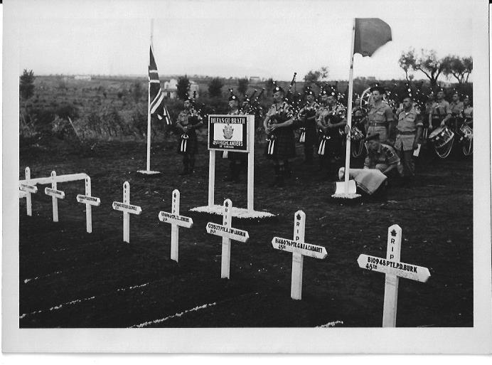 The 48th Highlanders Pipes and Drums plays behind graves at Piedmonte Cemetery, in late May 1944. Grave markers are shown of Pte Freeman, Sgt. D.K. Carswell, Pte A.J. McLaughlin, Pte B.F.A. Cadet, Pte. P.D. Burk.