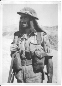 Sgt Cooper is wearing the uniform in which he landed at Pachino on 10 July. The convoy ship carrying personal gear and additional uniforms had been sunk in the Mediterranean. Sgt Cooper’s unorthodox netting covering the back of his neck was essential in the 40C heat of Sicily. P1458