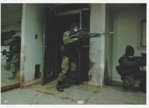 Highlanders storm into a room practicing House clearing drills during Exercise Crimson Tide. Pte Rod Petrovic enters at the ready. P2059
