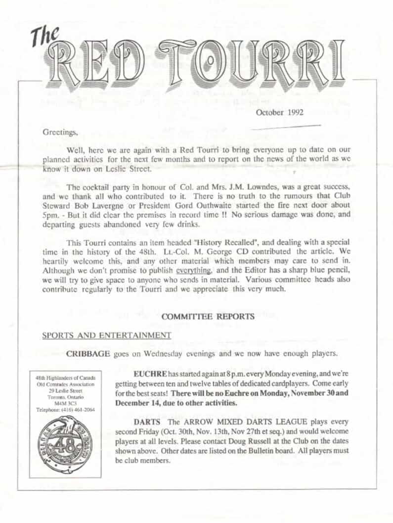 All members of the Old Comrades Association would receive copies of “The Red Tourri” published by the Old Comrades Association Executive to keep their membership informed of the happenings that were relevant to the time. The name of the bulletin refers to the red tourri on the 48th Highlanders balmoral. Other Highland units had a khaki tourri as did the 48th until they changed it in England during WWII.