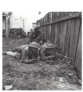 Troop with bren gun by a fence, in Italy Oct 1943. Bill Sodenberg on the bren.  This posed picture may be in late October when the 48th Highlanders were tasked to drive the Germans out of Torella so that the German artillery could not reach the Canadians in Campobasso.