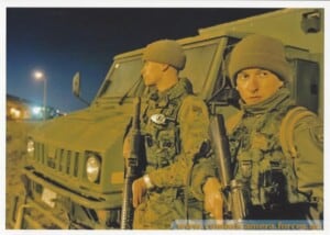 Two Highlanders, Cpl E Ivans and Cpl T. A. Green stand in front of an LSVW truck at the ready during a night exercise while securing the Domestic Response Unit’s (DRU) headquarters.