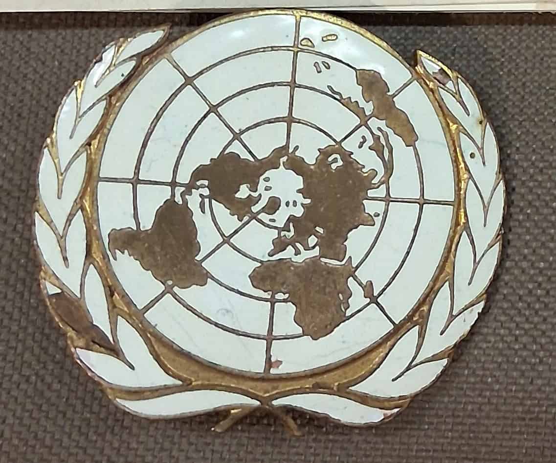 A 1.768 inch (4.49 cm) by 2 inch (5.08 cm) United Nations cap badge.