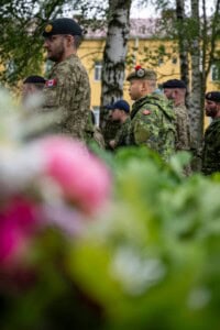 Warrant Officer Ferdinand General, 48th Highlanders, awaiting the commencement of the naming ceremony of Camp Labrie in Ceri Latvia, 01 July 2025. WO General was participating in Operation Reassurance, the training of Ukrainian Army recruits in Latvia.