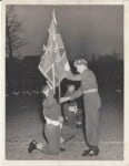 Commanding Officer, LCol J. Counsell hands the King’s Colour to Lt. S.G. Myron, on return of Colours to Regiment, at Varsity Arena in 1945. Lt Harvey Beal in rear awaiting …